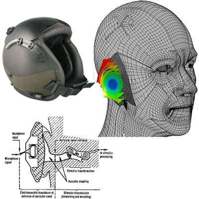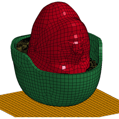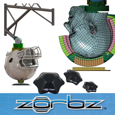 An FEA acoustic model was created of both pilot helmet and a human ear canal for predicting noise and communication intelligibility. The LS-DYNA model consisted of a sequence of structural modal, steady state dynamics (harmonic) and FEM acoustic analyses. Once modeled, iteration could be performed to improve helmet noise mitigation. | Simulations of NOCSAE football helmet tests have lead to a better understanding of impact protection limitations existing in current products and helped in development of injury reducing technology such as the Zorbz device shown above. The exercise was a result of the NFL's Play Smart Play Safe initiative that challenged innovators to propose new devices for improving the safety of the athletes. |