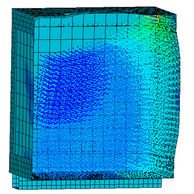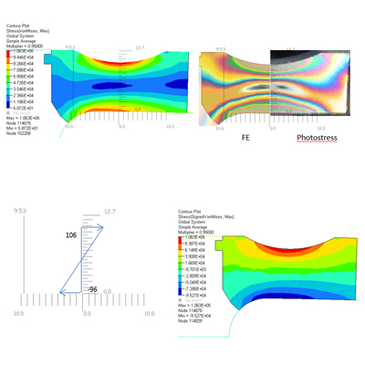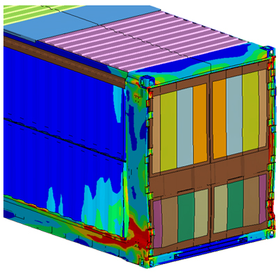A study of post-yield stress relaxation in Ti-6AL-4V due to vibration load was carried out by a combination of photo stress test methods and FEA. The numerical material model was improved to reflect behavior from the test. | An innovative collapsible shipping container was subjected to standard stacking and lifting cases per ISO standard. Detailed modeling of locks and hinges with rolling contacts allowed identification and elimination of failure modes. |