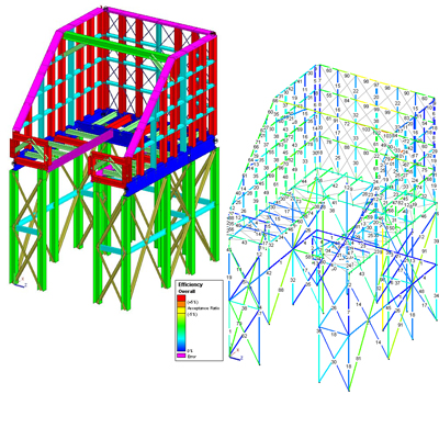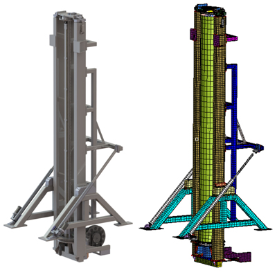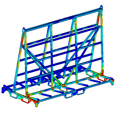 An analysis of an auxiliary innovative fuel tank was performed to simulate forces occurring during hard landing mishap. LS-DYNA solver was used to predict sloshing shock wave pressure induced on the tank walls. The fluid was modeled using an efficient meshless approach. | A light-weight transport rack used in the manufacturing of aluminum doors and windows was analyzed under various loading conditions that included fork lift pick up, braking, unloading and sudden stop. |