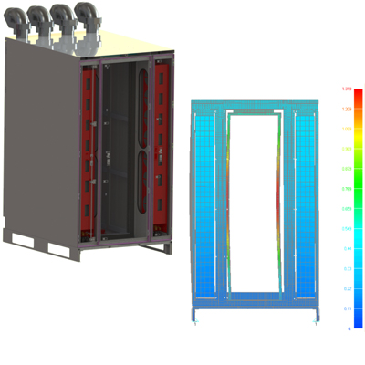 Simulation of a medical device part transfer between bowl feeder and serializing laser to optimize actuator travel. | Seismic analysis of a data center server rack to assess compliance with GR-63 Network Equipment Building Systems (NEBS) requirements was performed. After initial analysis, floor rails were redesigned to achieve Zone 4 performance. |