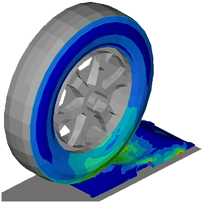 The objective of the analysis was to determine stresses induced by the wheel as it traversed the wheel chock. In order to predict an accurate pressure distribution, the tire was modeled using an elastomeric (rubber) material. Modeling the event as a single, dynamic simulation simplified the exercise by eliminating the need for multiple static analyses. | Simulation of a seat absorbing mechanism during crash landing was performed to predict spine and neck injury experienced by the occupant. Various sized virtual human manikins were employed in the study. The approach allowed elimination of a number of costly, physical tests. |