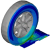 Tire Traversing a Ramp Using LS-DYNA, a finite element analysis simulation was performed to simulate a tire traversing a ramp. The pressurized tire and ramp were modeled accurately in order to effectively describe contact pressures. Additionally, stresses were evaluated along all points of the traversed path. |